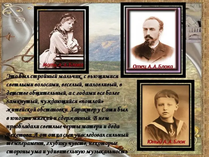 Барские навыки его стародворянской семьи были облагорожены высокой культурностью всех ее членов, которые из поколения в поколения труженически служили наукам. Отец поэта - профессор Варшавского университета, философ, музыкант, мать Блока и две ее сестры - занимались литерат. переводами. Дед по матери Андрей Николаевич Бекетов ученый-ботаник, ректор Петербургского университета, жена деда, бабушка Блока - дочь известного исследователя Средней Азии, сама занималась литературой, научными и художественными переводами. А будущая жена - дочь знаменитого химика Д.И. Менделеева.