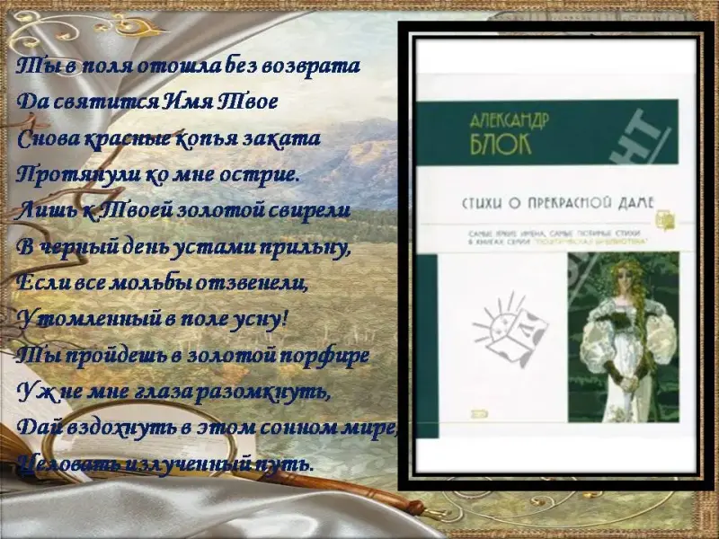 14 ведущий: Творчество А. Блока «мужало, но никогда не теряло изначального запева юношеской книги «Стихов о Прекрасной Даме». Самое заветное, что сохранил автор в этой книге, - страстное стремление к абсолютным ценностям, способным оправдать жизнь.