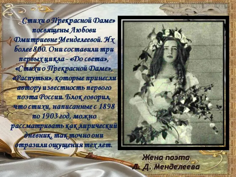 4 ведущий: Путь из «бекетовской теплицы» к людям, к «страшному миру», его катастрофической хаотичности был трудным и психологически сложным. Не чувствовал он гармонии и в своей душе, а гармония была желанна, необходима, без нее было невозможно жить. Ее принесла поэту любовь. Любовь была призвана «заклясть хаос» не только в душе поэта, но и в окружающем его мире. Блок обожествлял Любовь, потому что она открывала ему сверхличный, высокий смысл жизни.