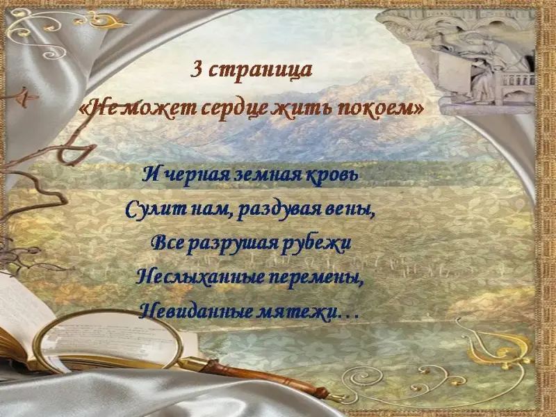4 ведущий: Но он любил этот неуютный мир. Родной простор, где история вплеталась в настоящее. Он чувствовал себя неотделимым от красоты, тишины. Это были его доли, его жизнь, его Россия. Стихи звучат как призыв и клятва: