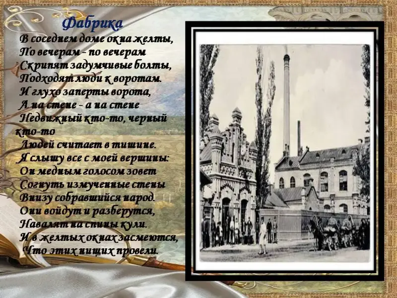 13 ведущий: Вскоре Блок создает стихотворение, резко отличающееся от всего написанного ранее, - «Фабрика». Поэт с новой вершины глянул на мир и увидел, что кроме Прекрасной Дамы есть еще и «согнутые спины», на которых «тяжело лежит работы». Для него наступает пора открытий. Скорбная музыка стиха нагнетает ощущение мрачного неблагополучия.