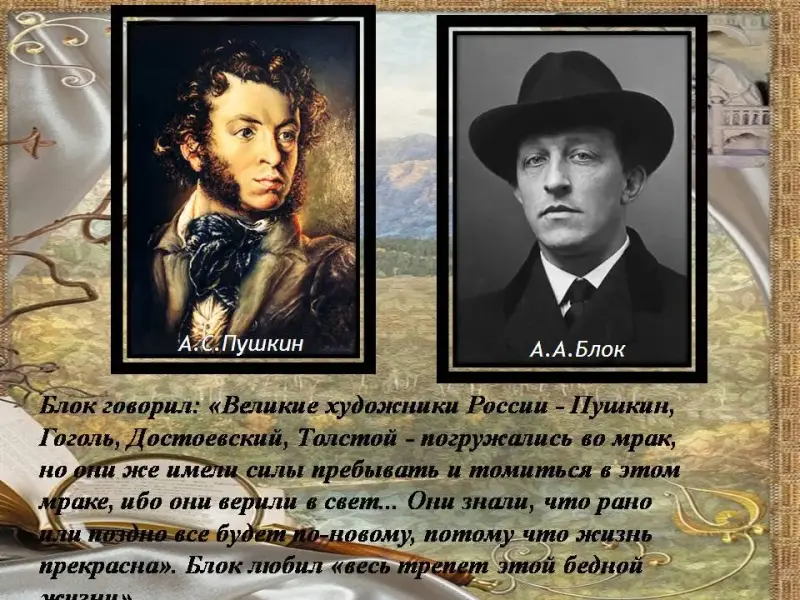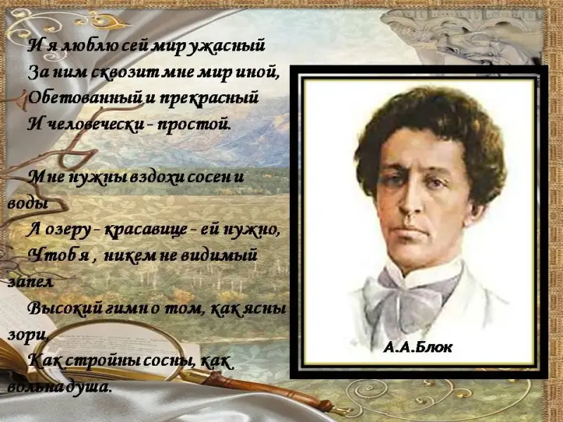 Учитель: Сегодня мы будем говорить о великом поэте, имя которого золотыми буквами вписано в историю русской поэзии. Значение творчества Александра Блока невозможно переоценить. Он - слава и гордость русской нации. Его поэтическая звезда сияет высоко над сегодняшним днем, а свет поэзии льется мерно, величаво и гордо: