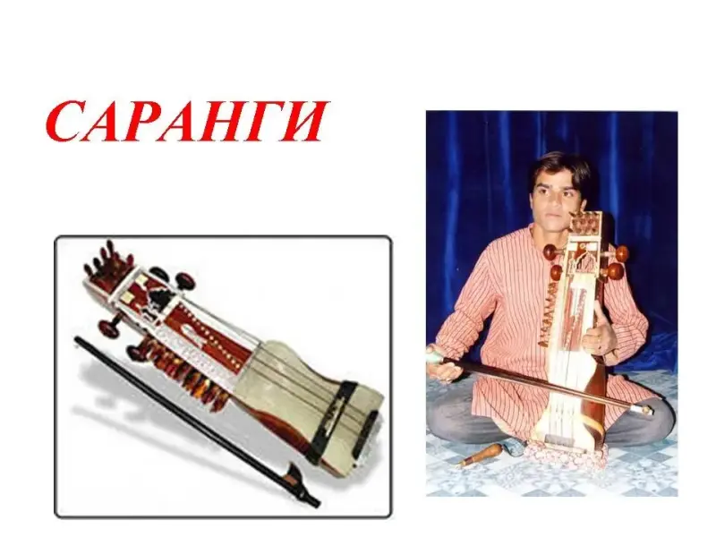 Учитель: Появление скрипки сопровождается множеством легенд и загадок. Тайной осталась и история её возникновения. Такого инструмента не знали ни древние греки, ни римляне. Возможно, родиной скрипки была Индия. Струнно-смычковый инструмент "саранги" относится к семейству скрипок. (слайд5 )