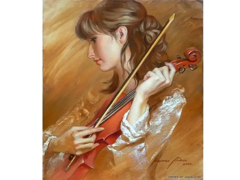 Учитель: Изготовить смычковый инструмент - тяжелый труд и большое искусство. В маленькой скрипке - более 40 деталей. Говорят, что скрипка поет. И правда, звучание ее похоже на трепетный человеческий голос. Корпус скрипки очень изящен: с плавными закруглениями, тонкой "талией".