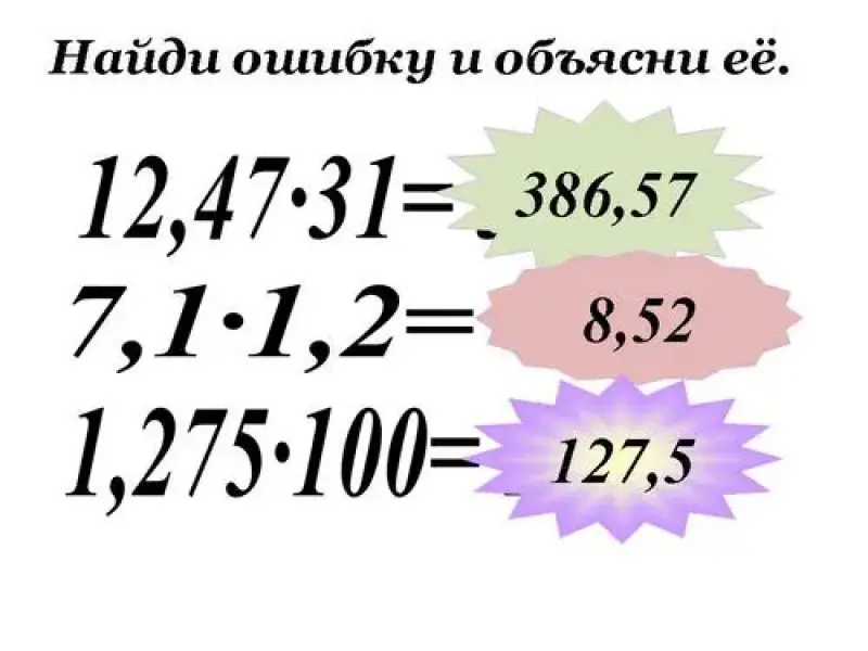 - образовательная: закрепить и усовершенствовать навыки умножения десятичных дробей; отработка навыков устного счёта; выработка умений по применению полученных знаний; проверить степень усвоения материала путем проведения теста с проверкой на уроке.