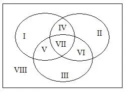 При пересечении 3-х множеств образуется VIII областей: 3 области без пересечения, 4 области пересечения множеств и 1 область, лежащая за пределами выделенных множеств.