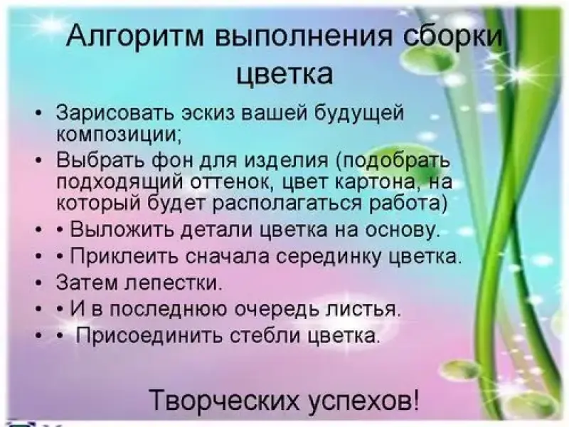 -Давайте составим алгоритм выполнения сборки цветка, ведь наша композиция будет состоять из цветов: