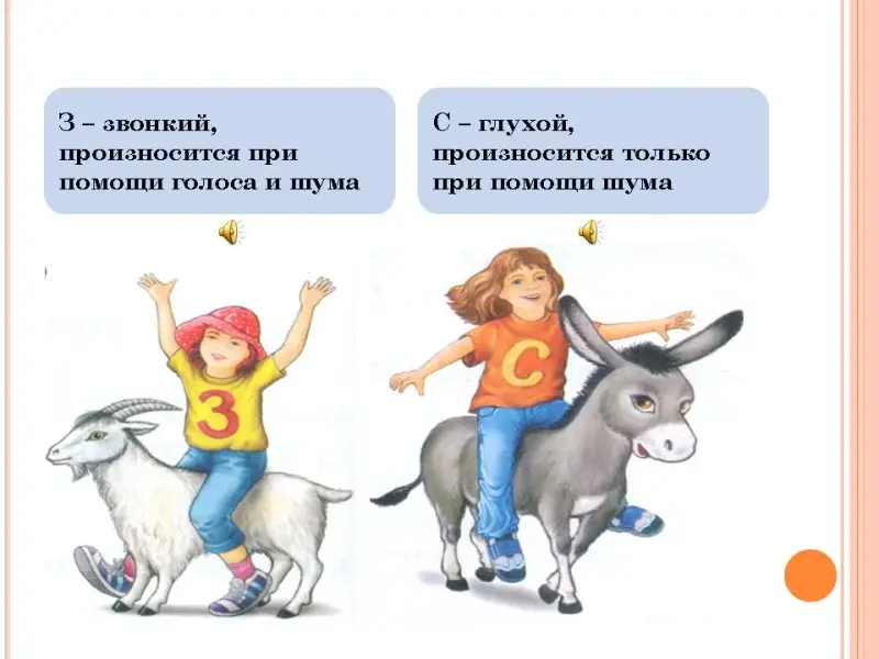 Логопед: Мы с вами отправляемся в гости к нашим новым друзьям Зайцу и Лисе в страну твёрдых звуков З - С. Возьмите зеркала и произнесите по очереди звуки З - С. При произнесении этих звуков: губы растянуты в улыбке. Зубы сомкнуты. Кончик языка упирается в нижние передние зубы. Боковые края языка прикасаются к внутренней стороне верхних коренных зубов. Струйка воздуха выдыхается посередине языка, на поднесенной ладони ощущается холодный воздух. Слайд 5. Звук З - звонкий, произносится при помощи голоса и шума. С - глухой, произносится только при помощи шума. Слайд 6.