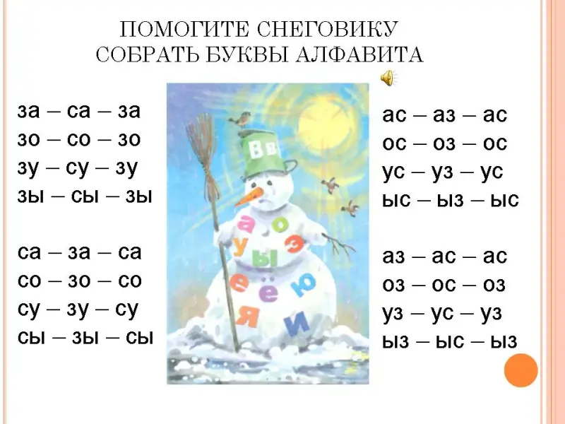 Логопед: Друг Зайца и Лисы, Снеговик рассыпал буквы алфавита и очень расстроился! Помогите ему их собрать. Для этого произносите (читайте) слоги за мной: