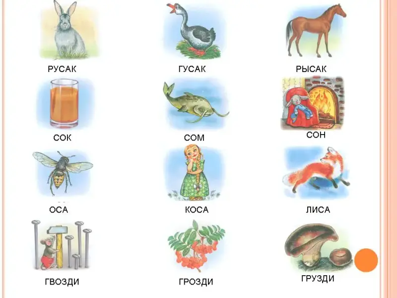 Логопед: Мы отправляемся дальше в наше путешествие. Лиса и Заяц приготовили для вас задание посложнее. Посмотрите на картинки, назовите каждую. Произнесите слова, выделяя голосом звуки, которыми они отличаются. Сравните слова по смыслу и по звучанию.