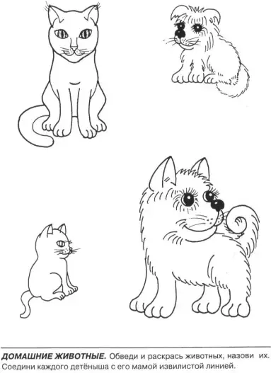 каких животных и птиц называют домашними? Где они живут? Какую пользу приносят человеку? Как человек заботиться о них? Чем питаются домашние животные и птицы? Как называются их детеныши? Рассмотрите части тела домашних животных и птиц, поговорите об отличительных признаках. (у коровы есть вымя, у курицы есть крылья, у лошади есть грива….) Уточните обобщающее понятие - домашние животные, домашние птицы. 2. Рассмотрите картинки "Скотный двор", "Птичий двор", "Корова с теленком", "Кошка с котенком", "Собака со щенками" и др., побеседуйте по картинкам. Побуждайте детей отвечать полными предложениями, составлять рассказ по картинкам. 3. Игра "Кто спрятался? " (с картинками или игрушками), "Кого не стало?" "4 - лишний". 4. Игра "Чей детеныш?" (с картинками) Взрослый показывает картинку с изображением животного, дети подбирают картинку или называют детеныша: теленка, жеребенка, поросенка, щенка котенка, цыпленка, индюшонка, гусенка, утенка. 5. Продолжи предложение Кошка любит …. Собака сторожит ….. Лошадь пасется …. 6. Поиск определения "Назови, какой и какая ?" Петух - красивый, резвый, задиристый, храбрый, воинственный, разноцветный, большой. И далее об утке, гусе, курице, цыпленке, собаке, лошади, корове по образцу. 7. Игра "Кто что ест" (с картинками, по типу лото) лошадь, собака, кошка, корова, курица, гусь, свинья, коза. 8. "Кто как разговаривает?" с картинками Как "говорит" корова? Собака? Кошка? Лошадь? Курица? Петух? И др. Уточните: кошка - мяукает, собака - лает, корова - мычит… и др. 9. Назови по действию "Кто что делает?" - гогочет, - крякает, - кудахчет - кукарекает, - пищит, - балаболит - мычит, - ржет, - хрюкает, - лает 10. Игра "Бывает - не бывает" (можно использовать картинки) Взрослый задает вопросы - дети отвечают "да - нет" У коровы есть рога? Кошка царапается? У лошади есть крылья? Свинья дает молоко? и др. 11. Игра "Кто с кем живет?" Котенок живет с кем? - Котенок живет с кошкой. (Щенок, жеребенок, цыпленок, утенок, теленок …) 12. Игра "Сравни" Кто больше - собака или щенок? Собака больше щенка. (котенок и кошка, лошадь и жеребенок, теленок и корова). 13. Игра "Сосчитай до пяти" Один пушистый кот -…… Одна рябая курица - …… Одна быстрая лошадь - ….. Один ретивый конь - …… Одна домашняя утка - ….. Один красивый селезень - …. 14. Игра "Назови ласково" кошка, собака, хвост, когти, шерсть, усы, уши, лапы. 15. Игра "Что не так?" Кошка мычала на диване. Собака лает на своих. Лошадь дает шерсть. Коза клюёт молоко. 16. Игра "Кто где живет?" Лошади - в конюшне Коровы - Свиньи - Собаки - Телята - Кролики - 17. "Какое слово самое короткое?" Собака, кот, корова, коза. Петух, индюк, гусь, курица. 18. Игра "Объясни словечко". Табун - много лошадей Стадо - Отара - Свора - 19. Игра "Что общего и чем отличаются?" Собака и волк. Корова и коза. Курица и утка. 19. Объясни пословицу. Купить кота в мешке. 20. "Сложные слова" Цель: упражнять в образовании сложных прилагательных способом сложения основ. У кошки длинная шерсть - длинношерстная. У кошки короткая шерсть - короткошерстная. У кошки гладкая шерсть - гладкошерстная. 21. "Что из чего делают?" Цель: развивать познавательный интерес, наблюдательность, обогащать словарный запас. - Что делают из молока коровы? (Сметану, сливки, творог, кефир, ряженку, сыр, йогурт.) - Зачем надо пить молоко и есть молочные продукты? (Без них нельзя вырасти здоровым. Кто не пьет молоко, у того портятся зубы, тот отстает в росте.) - Что мо