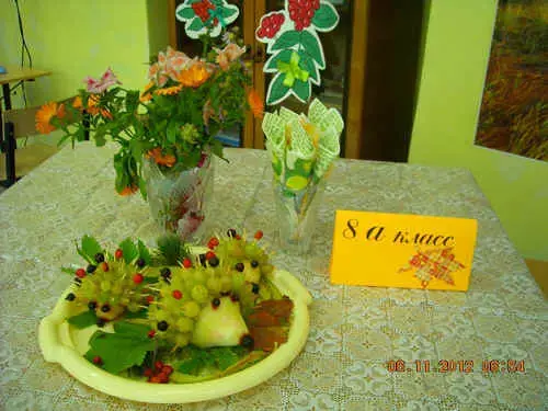 2 вед: Следующие конкурсы будут оцениваться одновременно. Это "Лучшее оформление столика", "Осенняя композиция", "Осеннее блюдо" и мы готовы полюбоваться вашими творческими исканиями.