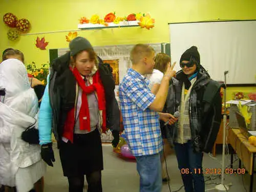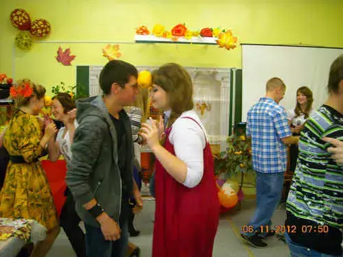 2вед: Желающие продолжить апельсиновую дискотеку есть? А собрать осенние поцелуи?Вижу много заинтересовавшихся. Юношам-участникам по одному из каждого класса сейчас раздадут по одному чистому листу. За определенное время они должны собрать как можно больше поцелуев, т. е. отпечатков губ на листе с изнаночной стороны. Причем оставить отпечаток девушка может только после поворота под рукой молодого человека.