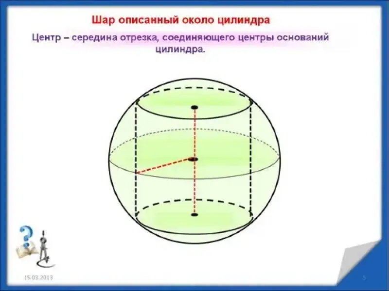 4. Шар описан около цилиндра. Где находится центр шара? Слайд №5
