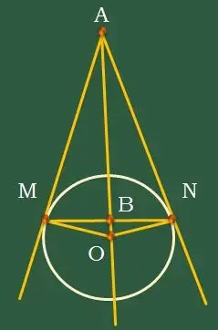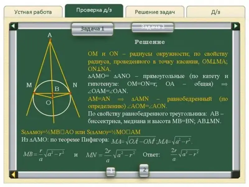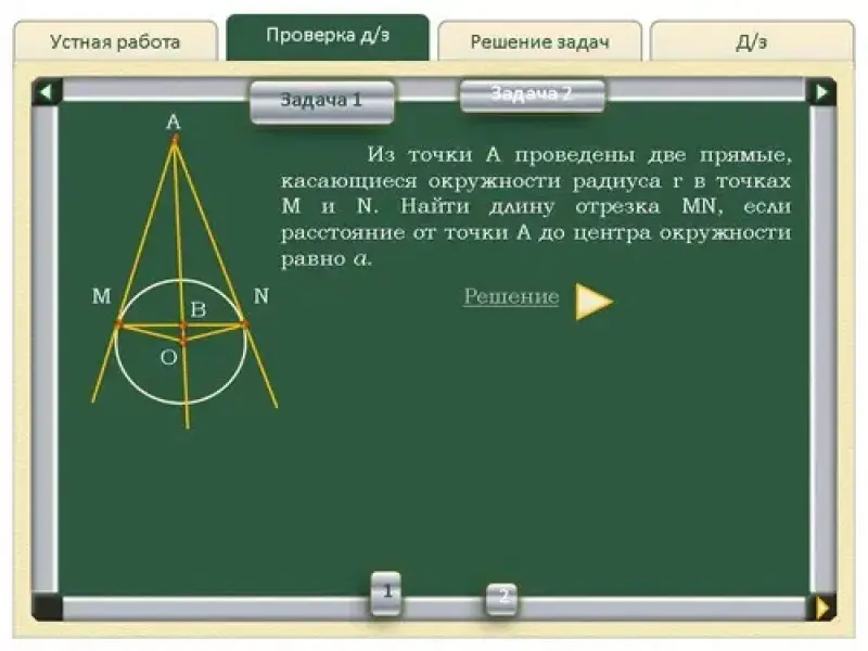 1. Из точки А проведены две прямые, касающиеся окружности радиуса r в точках M и N. Найти длину отрезка MN, если расстояние от точки A до центра окружности равно a. (см. слайды Проверка д/з - Задача 1) |