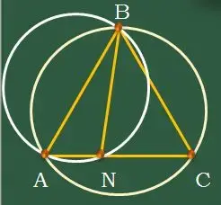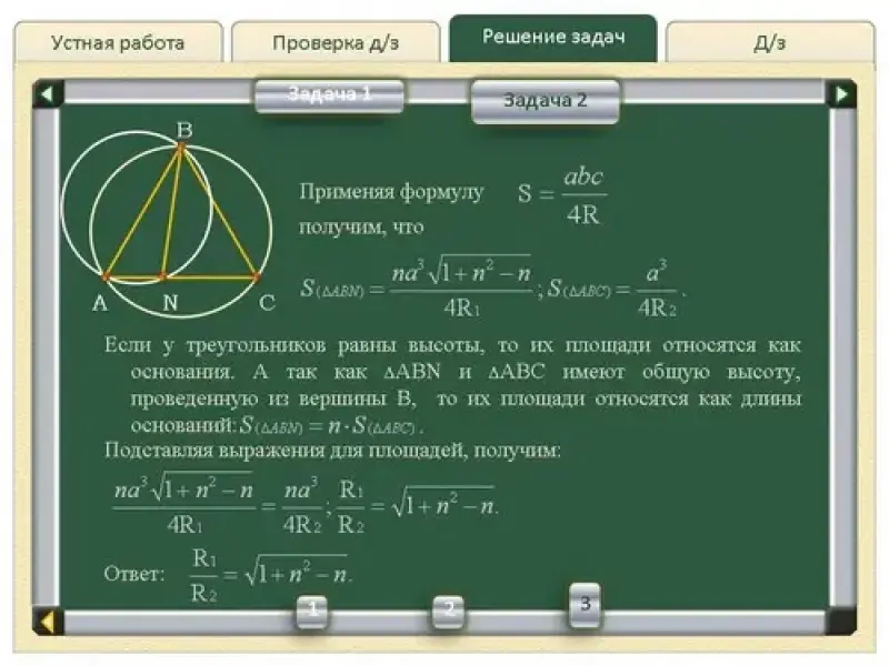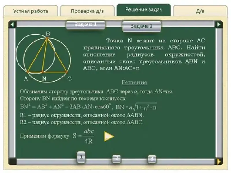 2. Точка N лежит на стороне AC правильного треугольника ABC. Найти отношение радиусов окружностей, описанных около треугольников ABN и ABC, если AN:AC=n (см.слайды Решение задач - Задача 2). |