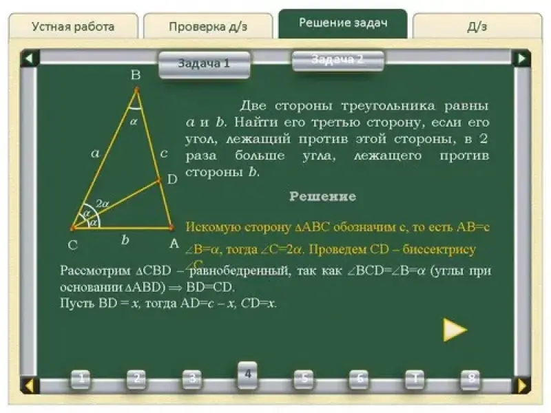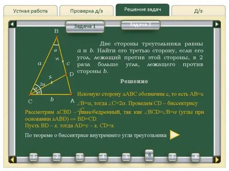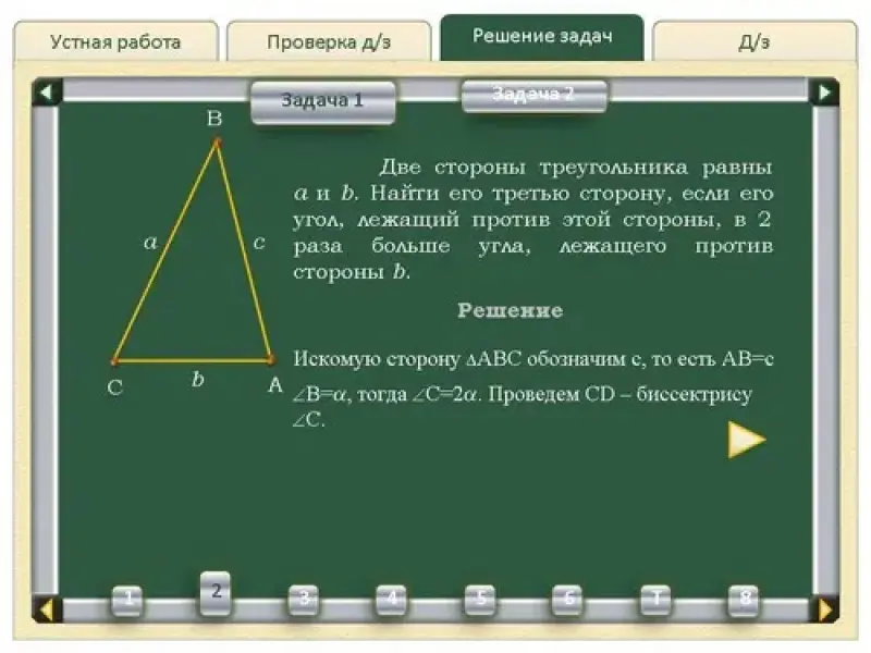 1. Две стороны треугольника равны a и b. Найти его третью сторону, если его угол, лежащий против этой стороны, в 2 раза больше угла, лежащего против стороны b (см.слайды Решение задач - Задача 1). |