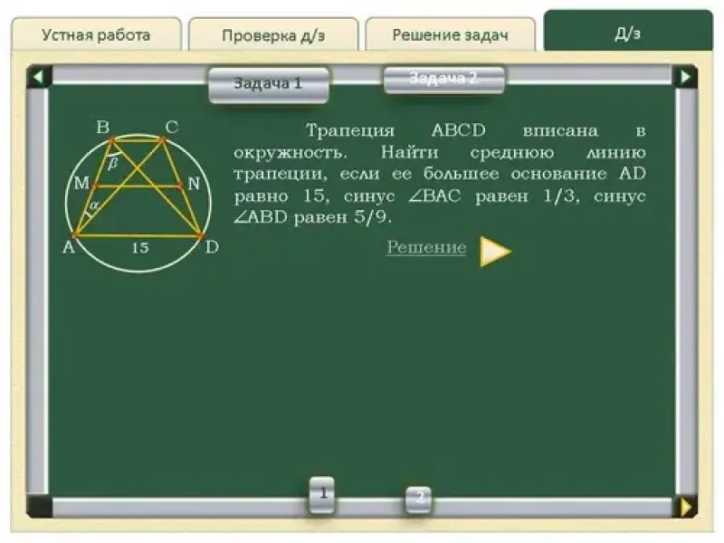 1. Трапеция ABCD вписана в окружность. Найти среднюю линию трапеции, если ее большее основание AD равно 15, синус |