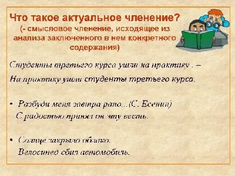 - (слайд 12) Одно и то же предложение может приобретать разный смысл. Любое расположение элементов высказывания имеет смысловой характер, называемый актуальным членением предложения. Актуальное членение предложения - смысловое членение, исходящее из анализа заключенного в нем конкретного содержания. Например, в предложении Аптека - на углу улицы исходной точкой (основой) является Аптека, а ядром высказывания - на углу улицы (на него падает логическое ударение). Если переставить слова, то получается актуальное членение: На углу улицы (основа высказывания), аптека (ядро высказывания). То есть, то, что нам было известно в данной ситуации, или может быть легко понято, и из чего исходит говорящий (тема и рема). Или еще пример: В предложении Студенты третьего курса ушли на практику сообщается о том, что сделали студенты. Если известно, что кто-то ушел на практику и необходимо сообщить, кто именно ушел, то расположение слов будет такое: На практику ушли студенты третьего курса.