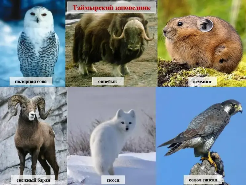 Более двадцати лет назад в таймырской тундре начали эксперимент по расселению овцебыка. Теперь около полутора тысяч этих интересных животных (первые особи были завезены из Канады и США) расселились по восточному Таймыру. Животный мир представлен немногими видами: лемминги, полярная сова, песцы, серебристая чайка. Из хищных птиц обычны мохноногий канюк и сапсан, устраивающие гнезда на труднодоступных уступах скал. Встречается кречет. Снежный (путоранский) баран забирается в горы на высоту до 1700 километров и выбирает для проживания такие места, где скалы соседствуют с пастбищами. Возникшая конкуренция с домашними оленями за пастбища привела к отстрелу животных пастухами, что сказалось на численности барана - он считается уже исчезающим редким видом.