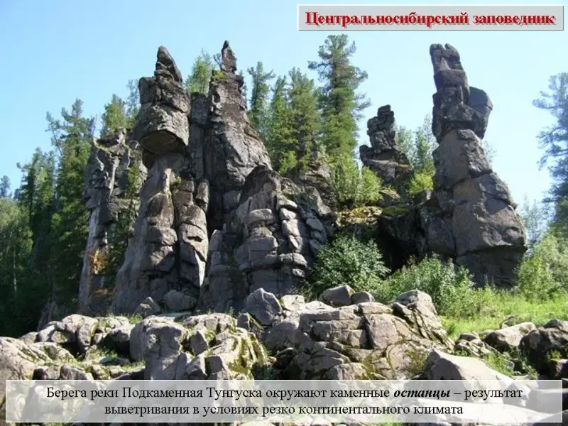 Берега реки Подкаменная Тунгуска окружают каменные останцы - результат выветривания в условиях резко-континентального климата («Тунгусские столбы»).