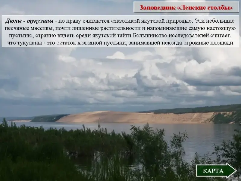 Дюны-тукуланы - по праву считаются «экзотикой якутской природы». Эти небольшие песчаные массивы, почти лишенные растительности и напоминающие самую настоящую пустыню, странно видеть среди якутской тайги. Здесь охотно селятся сосна и кедровый стланик, много полноводных озер. Большинство исследователей считает, что тукуланы - это остаток необычной холодной пустыни, занимавшей некогда огромные площади. Песчинки холмов обладают на редкость правильной шарообразной формой, что весьма характерно для так называемых «эоловых отложений».