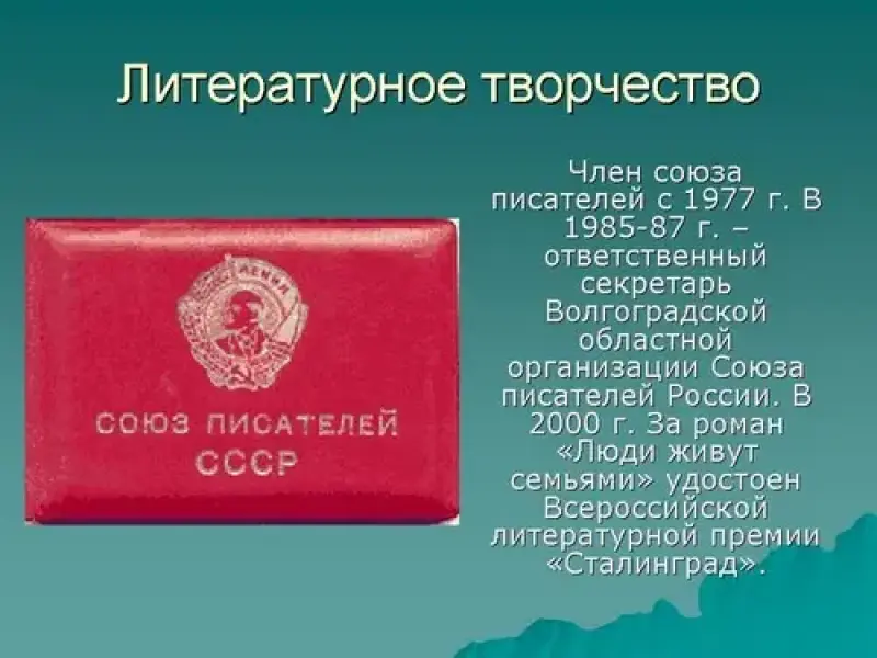 Слайд 5. Придя в Литературный институт поэтом, А. Данильченко вышел в 1973 году из него прозаиком, написав первую книгу романа "Люди живут семьями", которая и осуществила рвавшийся наружу интерес к героической и повседневной жизни народа. Роман этот дорабатывался уже в Волгограде, где выпускник Литинститута начал работать сначала литсотрудником многотиражной газеты Волгоградтяжстроя "Строитель", а с 1974 года - редактором, затем старшим редактором редакционно-издательского отдела Высшей следственной школы, и вышел в свет в 1976 году.