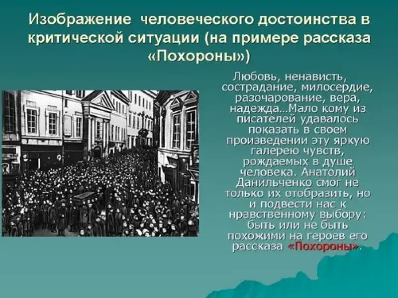 - Давайте подведем итог. Слайды 13-15 .Анатолий Данильченко в этом рассказе мастерски выстраивает градацию похорон: "пышные", "средние", "скромные" - и это деление распространяется и на мир людских чувств: горе по сценарию, горе напоказ и горе человеческое. Его произведение заставляет нас, читателей, задуматься над многими вопросами бытия, решить для себя дилемму: быть человеком или нелюдем.