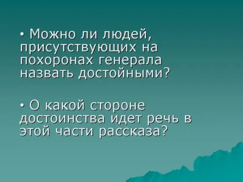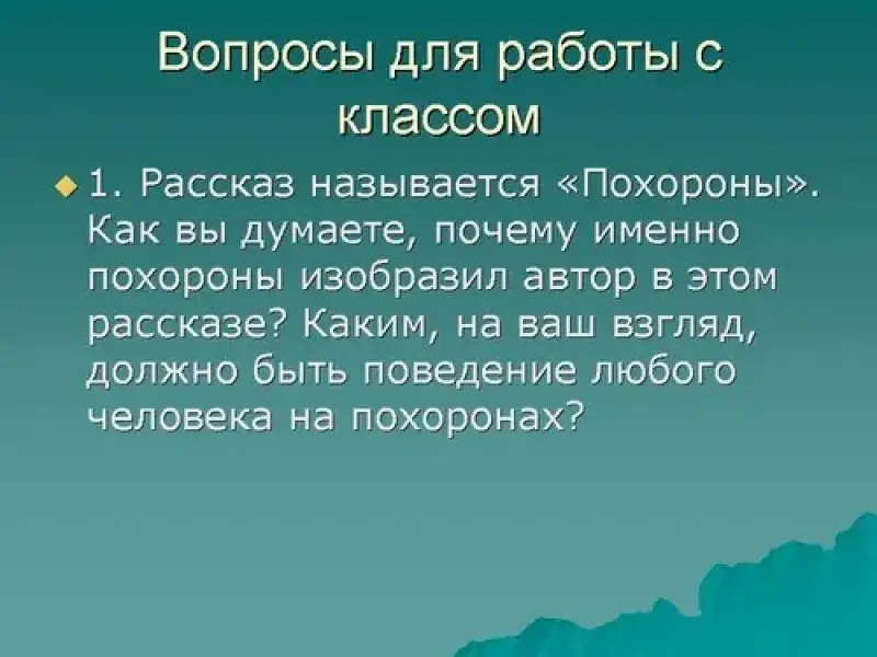 1. Рассказ называется "Похороны". Как вы думаете, почему именно похороны изобразил автор в этом рассказе? Каким, на ваш взгляд, должно быть поведение любого человека на похоронах?