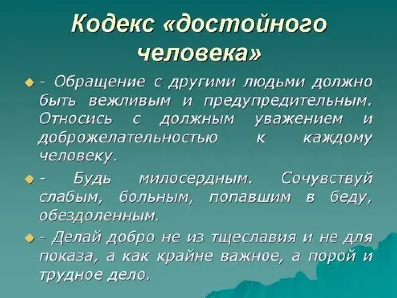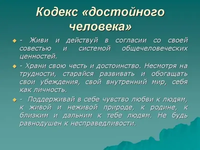 - Храни свою честь и достоинство. Несмотря на трудности, старайся развивать и обогащать свои убеждения, свой внутренний мир, себя как личность.