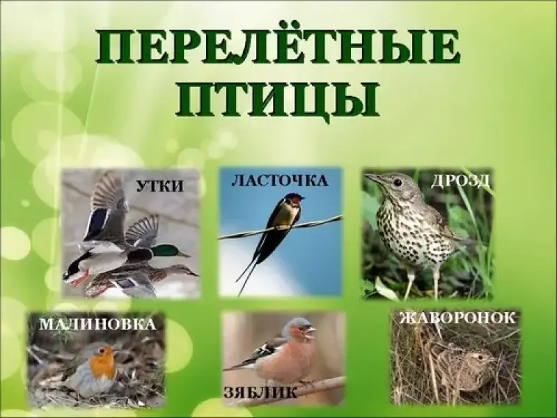 (Соловей, ворона, скворец, воробей, дятел, жаворонок, синица, кукушка, сорока, журавль, голубь и т. д.)