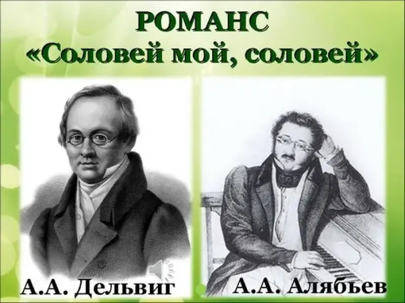 - Это стихотворение написано в духе русских народных песен. Композитор Александр АлександровичАлябьев(1787-1851) написал музыку. Так появился романс "Соловей мой, соловей". В русской народной лирике соловей - вольная пташка, друг, верный крылатый посол, символ ласковости и нежности. Послушайте отрывок из романса.
