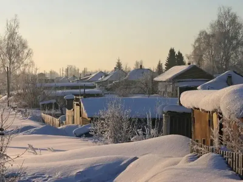 В дом стоят сугробы снега.