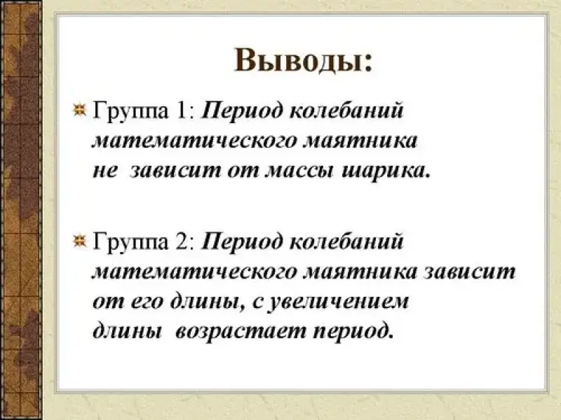 - Вывод группы 2: Период колебаний математического маятника зависит от его длины, с увеличением длины возрастает период.