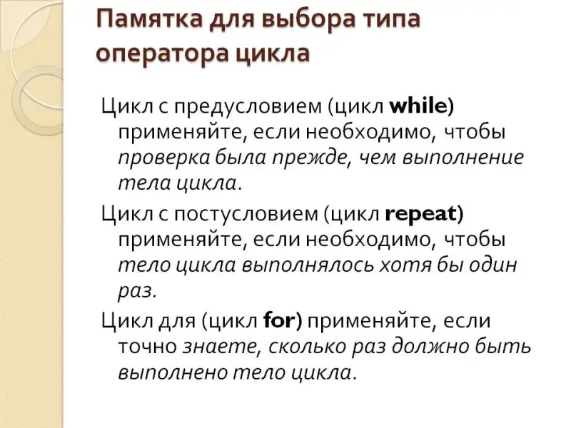 Памятка для выбора типа оператора цикла (Слайд 13)