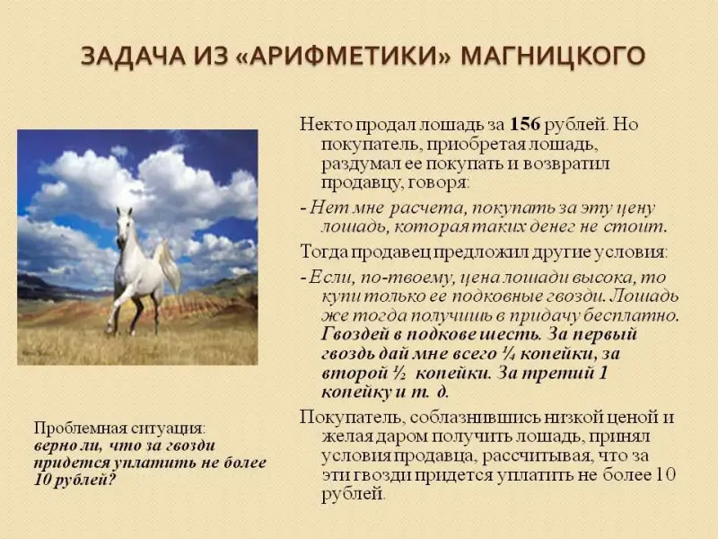 2. В старинной «Арифметике» Магницкого приведена следующая задача: (Слайд 4)
