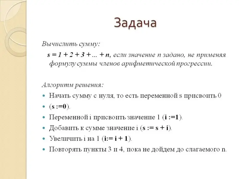 Рассмотрим задачу на вычисление большого числа слагаемых: Вычислить сумму: s = 1 + 2 + 3 + ... + п, если значение п задано, не применяя формулу суммы членов
