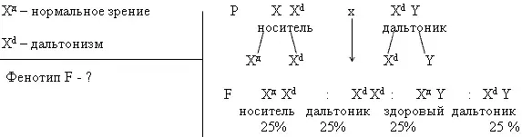Ответ: 50 % детей будут дальтониками, 50 % - иметь нормальное цветовое зрение, но половина дочерей будут носителями.