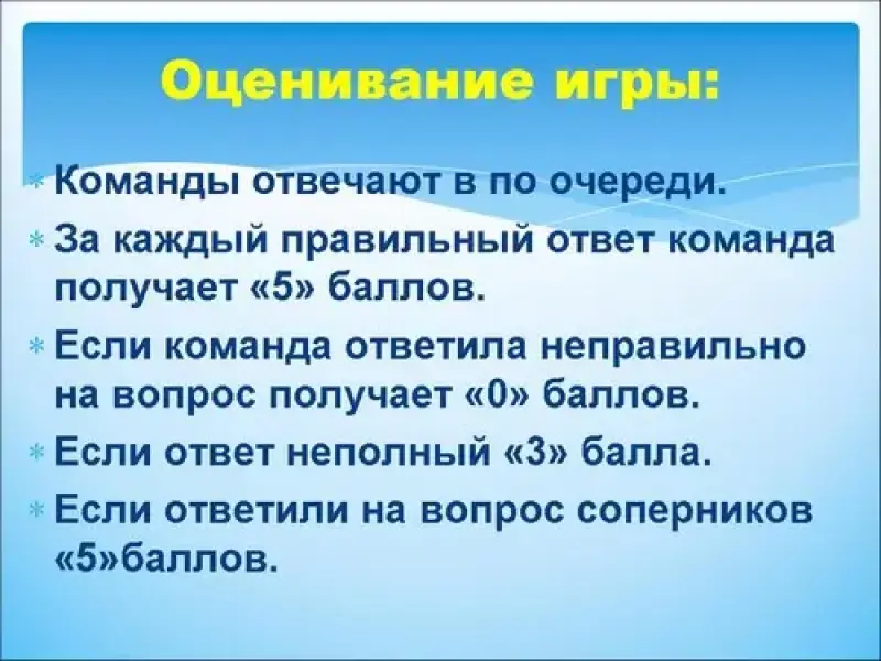- Если команда отвечает неправильно на вопрос, получает "0" баллов.