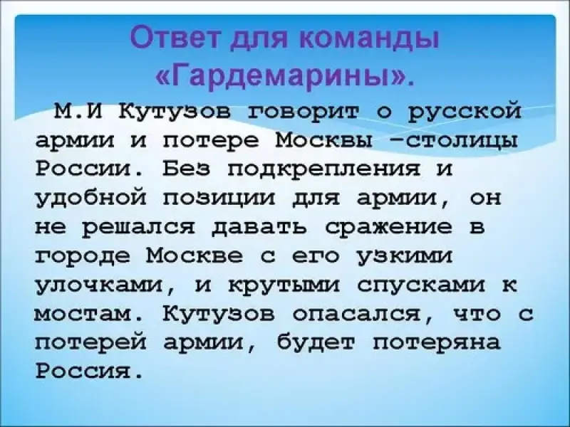 "Гардемарины" "...Позади позиции, Москва - река ... За ней город с узкими улицами и переулками. Спуски к восьми мостам так круты, что только пехота может сойти по ним. Ежели неприятель опрокинет наши передовые линии - вся армия будет уничтожена до последнего человека... Пока цела армия, есть надежда с честью кончить войну. С потерей армии не только Москва - вся Россия будет потеряна...".