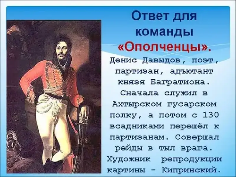 Ответ "Ополченцы": 1. Денис Давыдов- поэт -партизан, адъютант князя Багратиона. Служил в Ахтырском гусарском полку, а потом с 130 всадниками перешёл к партизанам. Совершал рейды в тыл врага. Художник картины Кипренский.