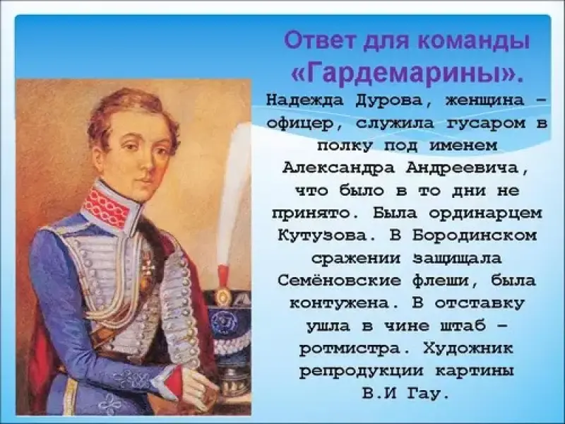 Ответ "Гардемарины" 1. Надежда Дурова, женщина офицер. служила в гусарском в полку под именем Александрова Александра Андреевича что было в те дни не принято. Была ординарцем Кутузова. В Бородинском сражении защищала Семёновские флеши, была контужена. В отставку ушла в чине штаб - ротмистра. Художник репродукции картины В.И Гау.