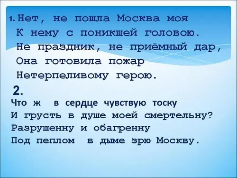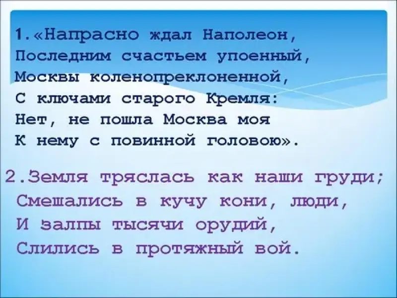 Ответ: 1. А. С. Пушкин. "Евгений Онегин" Наполеон в Москве ждал, что Россия подпишет акт о сдаче города, но напрасно. 2.М.Ю.Лермонтов. "Бородино" О бородинском сражении.