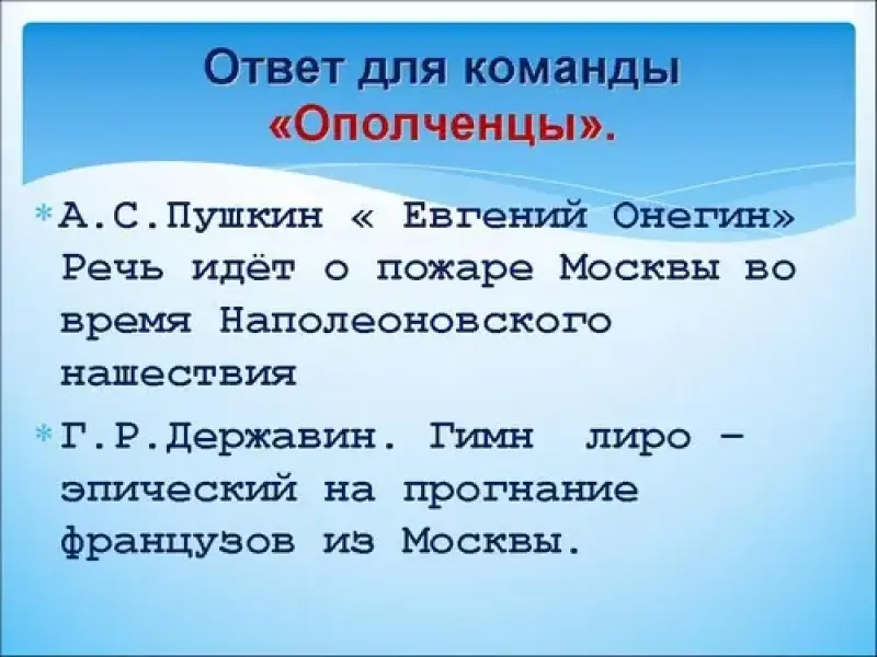Ответ: 1. А.С.Пушкин "Евгений Онегин" . Речь и дёт о Пожаре Москвы во время Наполеоновского нашествии. 2. Г.Р. Державин. Гимн лиро-эпической на прогнание французов из Москвы.