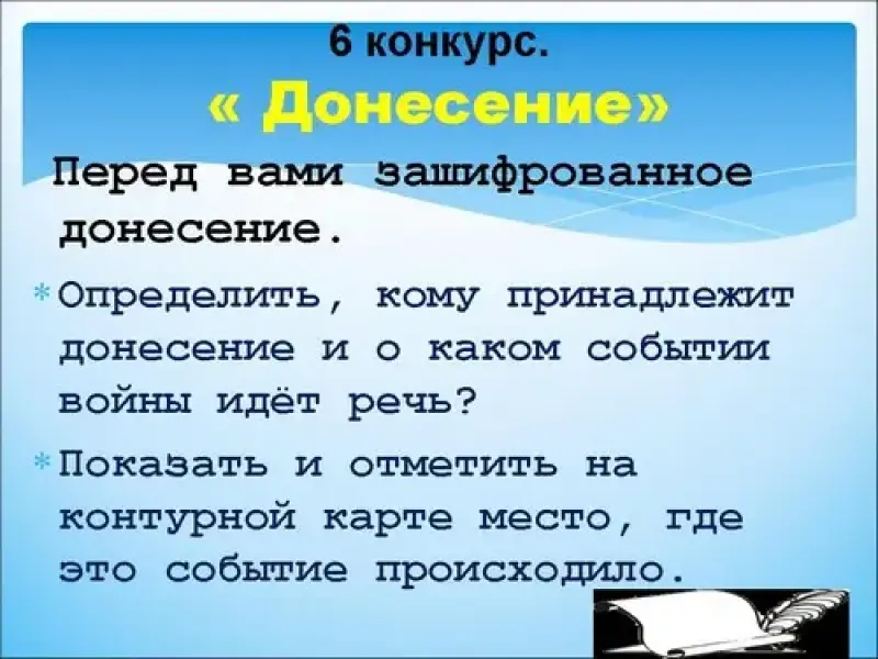 Вопрос: Определить, кому принадлежит донесение? О каком событии войны идёт речь? Показать и отметить на контурной карте место, где это событие происходило?