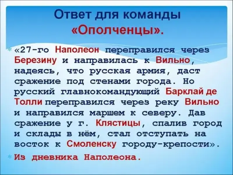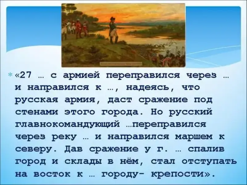 "Ополченцы": " 27-го ... с армией переправился через ... и направился к ,.., надеясь, что русская армия, примет сражение под стенами города. Но русский главнокомандующий ... переправился через реку ... и направился маршем к северу. Дав сражение у города ..., спалив город и склады в нём, стал отступать на восток к ... городу - крепости".