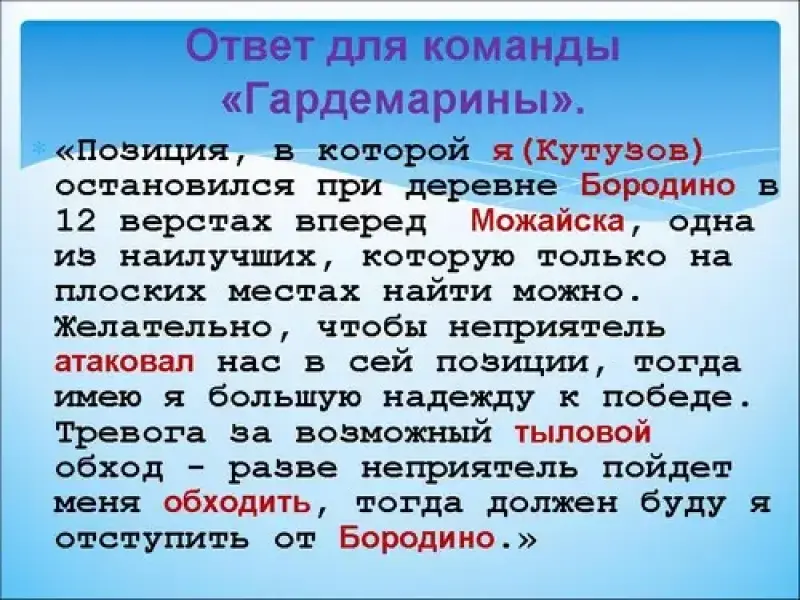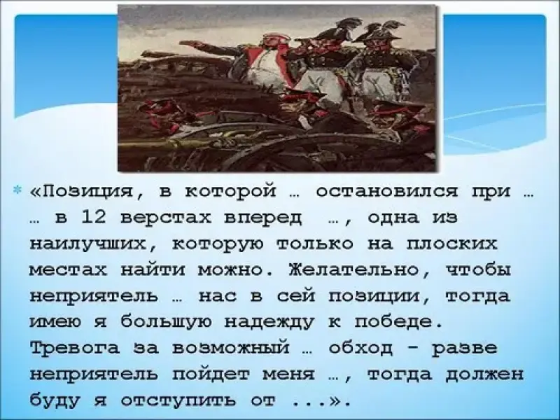 Ответ: "Позиция, в которой Кутузов остановился при деревне Бородино в 12 верстах вперед Можайска, одна из наилучших, которую только на плоских местах найти можно. Желательно, чтобы неприятель атаковал нас в сей позиции, тогда имею я большую надежду к победе. Тревога за возможный тыловой обход - разве неприятель пойдет меня обходить, тогда должен буду я отступить от Бородино".
