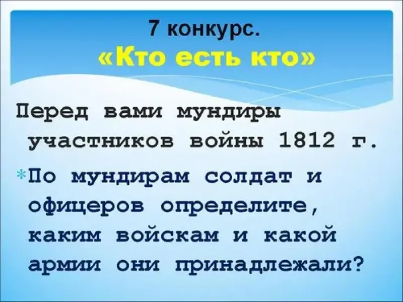 Перед вами мундиры участников войны 1812 г. По мундирам солдат и офицеров определите, каким войскам и какой армии они принадлежали? (за каждый правильный ответ 1 балл).