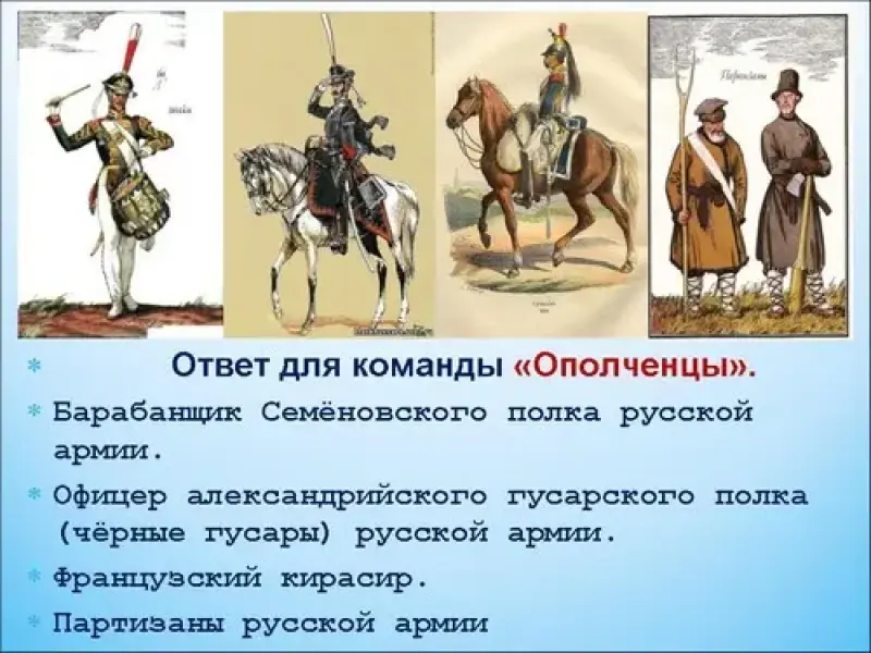 "Ополченцы": Ответ: 1.Барабанщик Семёновского полка русской армии. 2. Офицер александрийского гусарского полка (чёрные гусары) русской армии; 3. Французский кирасир; 4 Партизаны русской армии.