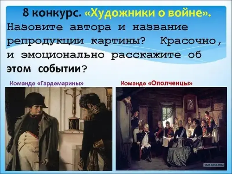 Вопрос: Назовите автора и название репродукции картины? (Экскурсоводы от каждой команды готовят описание картины). 1. "Наполеон и генерал-адъютант Лористон", 2. "Военный совет в Филях"